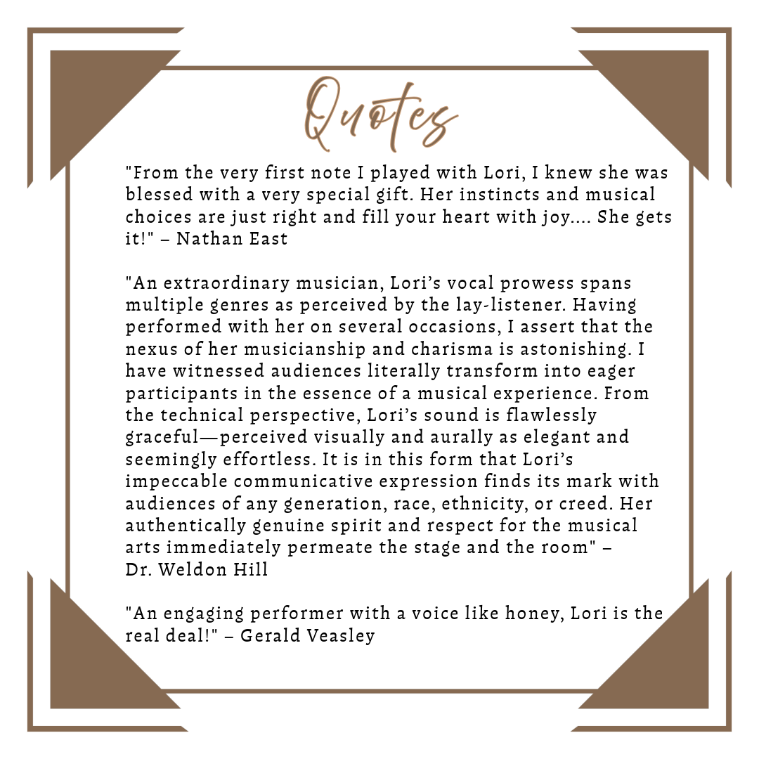 For over three decades, Lori Williams has had the honor of working with many notable artists as lead / background / studio session / guest vocalist including Oleta Adams, Marcus Adams, Yolanda Adams, Nikita Agafonov, David Archuleta, Marcos Ariel, Rob Bargad, Regina Belle, Eric Benet, The Blackbyrds, Michael Bowie, Willie Bradley, Karen Briggs, Norman Brown, Tom Browne, Peabo Bryson, Chuck Brown, Wayne Bruce, Jerry Butler, Jonathan Butler, Paul Carr, Terri Lyne Carrington, TC Carson, Gene Chandler, Renato Chicco, Stanley Clarke, Nick Colionne, Collaboration, Michael Colyar, Adrian Crutchfield, John Davis, John Di Martino, Will Downing, Joris Dudli, George Duke, Nathan East, Rodney M. Edge, Troy Sol Edler, Kevon Edmonds (After 7), Herb Fame, Jorel "JFLY" Flynn (HBIYD), Derrick Gardner, James Genus, Jazmin Ghent, Tres Gilbert, Savion Glover, Chelsey Green, Slide Hampton, Winard Harper, Christian Havel, Walter Hawkins, Norbert Heger, Howard Hewett, Dr. W. Weldon Hill, Tony Hightower, Corcoran Holt, William Hubbard, Daryl Hunt, Yoron Israel, Jessy J, Al Johnson and The A-Team, Allyn Johnson (Divine Order), Marcus Johnson, Stanley Jordan, Jackiem Joyner, Michael Keul, Kindred the Family Soul, Ben E. King, James King, Anatoliy Kirnichnyy, Antoine Knight, Yishai Knoll, Saltman Knowles Group, Ignat Kravtsov, Rayshun LaMarr, Lavahi, Evgeny Lebedev, Alex Malheiros (Azymuth), Jimmy Masters, Maysa, Daniel McClain (After 7), Frank McComb, Marion Meadows, Najee, Jimmy Masters, Nathan Mitchell, Ed Neumeister, Marat Nikolaev, Milan Nikolic, Julia Nixon, Daniel Nösig, Antonio Parker, Phil Perry, Robert E. Person, Anne Phillips, Benjie Porecki, Lloyd Price, Chuck Redd, Robert Redd, Althea Rene, Anton Revnyuk, Lenny Robinson, Gino Rosaria, Ellie Saitoh and The Love Tambourines, Erwin Schmidt, Sylver Logan Sharp, Avery Sharpe, Art Sherrod, Oli Silk, Brian Simpson, Dick Smith, John Toomey, Tony Terry, Unit 3 Deep, Gerald Veasley, Chris Walker, Kevin Walker, Kim Waters, Doug Weiss, Anthony Wellington, Matthew Whitaker, Roz White, Bernhard Wiesinger (Poysdorf All-Stars), Vesta Williams, Larry M. Wilson, Angela Winbush, Sherry Winston, David Ylvisaker, Frederic Yonnet, et.al.